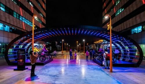 《Lightbattle III》(光之战车3)是一件独特的互动式自行车灯光艺术品,附在拱门装置上的近5000个LED灯分别由最先进的电脑系统控制,在拱门两端的下方各有三辆自行车,观众可以通过骑行来与灯光进行互动,冷暖光影的弧度变化源自观众骑行的速度与力量,通过参与一场尽兴的光之战,可以充分感受到一种奇趣欢愉的互动魅力。