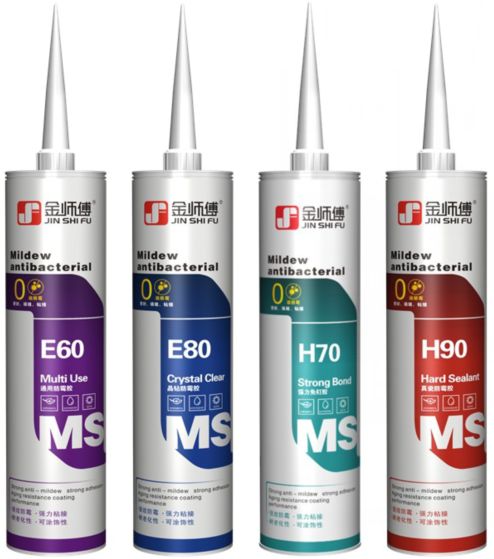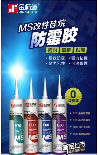 金师傅ms防霉胶还特别针对不同应用场景推出4款产品:通用防霉胶(E60):适用于门窗、墙角、踢脚线等要求较大位移能力的密封、封边;晶钻防霉胶(E80):适用于要求保持基材原貌的透明密封、封边及无影粘接;强力免钉胶(H70):适用于踢脚线、木地板、毛巾架等非结构性的粘接固定。重物粘接需做好定位支撑;真瓷防霉胶(H90):适用于厨卫用品等需要高硬度的密封、封边。每一款都经过特别研发,更加专业,效果更好。