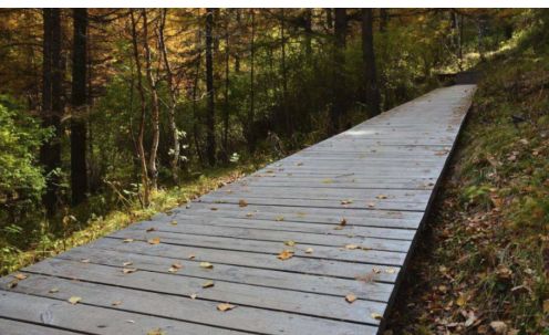 在园林景观中防腐木还可用来铺设栈道,主要是以山地公园以及森林公园的木栈道形式进行应用,踩上去既舒适又增加亲和力。