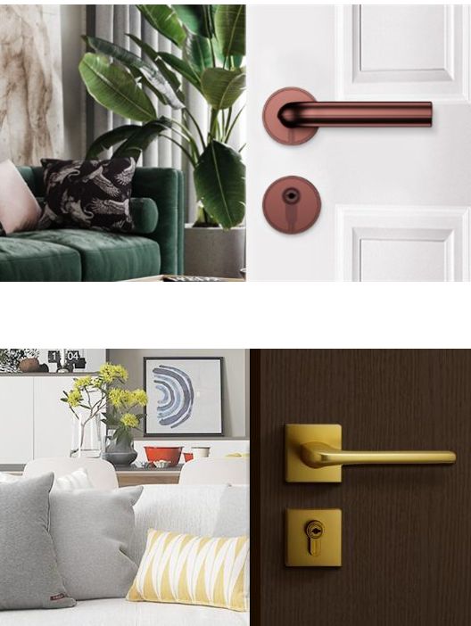 门的颜色通常分为浅色系木门和深色系木门,浅色系木门一般搭配深色门锁,如黑古叻、咖啡古铜色、砂青色等等;深色系木门一般搭配浅色门锁,如爵士金、玛瑙灰、复古铜等等。这样搭配可以实现提亮和点缀门扇的效果。