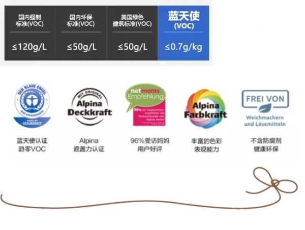 另外对于新房来说,环保性是重中之重的指标。阿尔贝娜先后获得了德国蓝天使(Blue Angel)认证,在产品安全、环境保护、 健康保护等方面都得到了业界权威认可,可以达到“即刷即住”的环保标准。