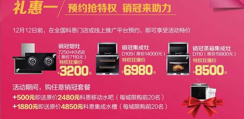 为迎接年终大促活动,中国厨电行业十大品牌,全品类厨电制造企业科恩电器推出了一系列钜惠措施,来回馈广大消费者。“格斗系”集成灶D109、“蒸箱款”集成灶D110、瞬吸不碰头的液晶平板烟机7250等一系列科恩销冠产品登台亮相,助阵活动现场,为持续升温的厨电市场再添一把“火”。凡在12月12日前,在全国科恩门店或线上推广平台预约的用户们,一系列的销冠产品皆能享受不同凡响的活动特权狂爆价。同时在活动期间,凡购任意销冠套餐另+500元即可免费享受原价2480元科恩移动水吧一台(每城限购前20名),+1880元即可免费享受原价4850元科恩集成水槽一台(每城限购前20名)。