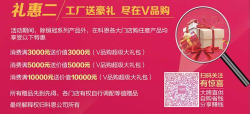 除用特权狂爆价购销冠系列产品外,中国厨电行业十大品牌,全品类厨电制造企业科恩电器还推出了工厂送豪礼尽在V品购的礼惠活动,消费满3000元送价值3000元(V品购超级大礼包),满5000元送价值5000元(V品购超级大礼包),满10000元送价值10000元(V品购超级大礼包),以此类推,(所有赠品先到先得,各门店有权自行调配等值赠品,最终解释权归科恩公司所有)。