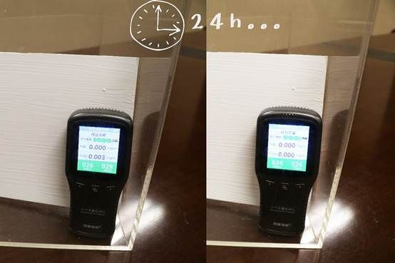 为了使测试的结果更精准,先对玻璃箱内的初始环境进行检测,测试结果显示甲醛测试仪各项指标都趋近于零。接下来我们将涂有德爱威尚潮墙面漆的木板放入玻璃箱内,等待24小时后再用测试仪进行测量对比。最后,让我们来看看静静待了24h之后的玻璃箱,发现甲醛测试仪各项指标仍然趋近于零。