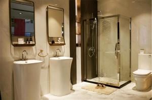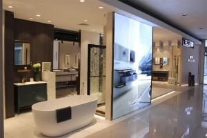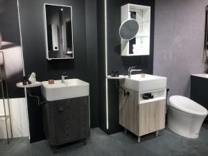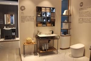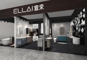 简约优雅的ELLAI宜来展位,极具设计感的产品,吸引观众驻足欣赏,实木浴室家具和莹润洁白的陶瓷,相得益彰,演绎最纯粹的设计格调。