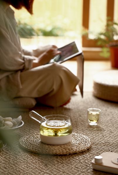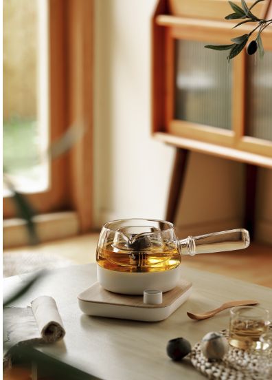 鸣盏养生煮茶器全透明的玻璃壶身设计在阳光下熠熠发光,壶内有一个可以拆卸下来的玻璃茶漏,再配上透明的玻璃手柄,整个壶身给人一种干净温馨的视觉印象。壶身下面配备方形的浅色木纹底座,造型小巧且不占地方。