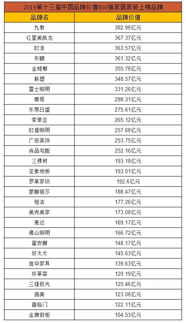 今年,中国品牌价值500强企业中,家居家装企业共有29个品牌上榜。九牧以382.98亿元位列业内第一,红星美凯龙以367.37亿元居于第二;第3名为欧派,363.57亿元。
