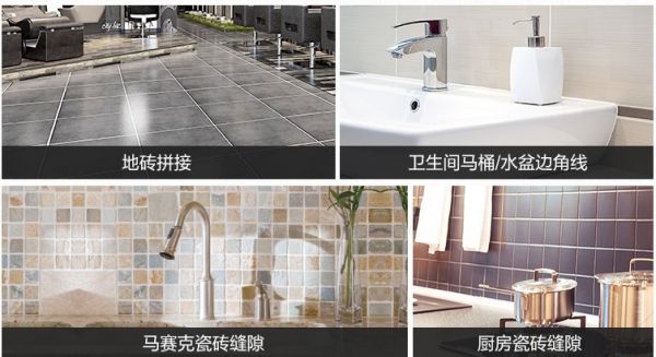 室内瓷砖、大理石等缝隙的装饰填充,厨卫器具的固定和修边,室内边角美化,也可用于各类硬质材料的粘结与修补。