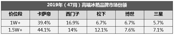 11月27日,中怡康47周冰箱数据发布。从单周数据可以看出,在万元以上,TOP5品牌为卡萨帝、西门子、三星、博世、松下。其中卡萨帝份额39.4%,西门子份额16.9%,博世和松下同为6.7%,三星为5.7%。1.5万元以上价位段中,5大品牌排名也几乎一致,但份额都略有提升,其中卡萨帝份额44.1%,西门子份额14%,松下超越博世,份额为12.1%,博世份额7.6%,三星份额7.1%。