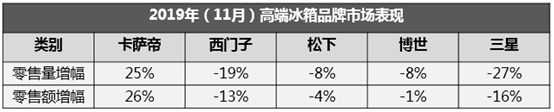 值得注意的是,11月整体数据(44-47周)有个很有趣的现象:5大品牌中,有4个品牌出现不同程度下滑,只有1个品牌实现3项唯一增长。比如零售量方面,三星、西门子、松下、博世分别下滑27%、19%、8%、8%,卡萨帝增长25%;在零售额方面,三星、西门子、松下、博世,分别下滑16%、13%、4%和1%,卡萨帝增长26%;市场份额方面,也是三星、西门子、松下、博世为负增长,卡萨帝为正增长。