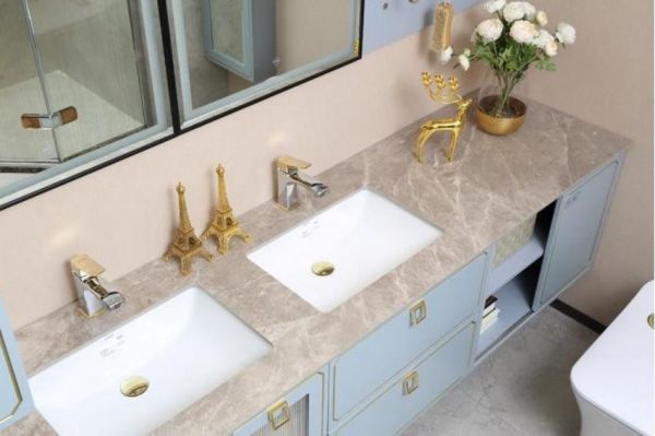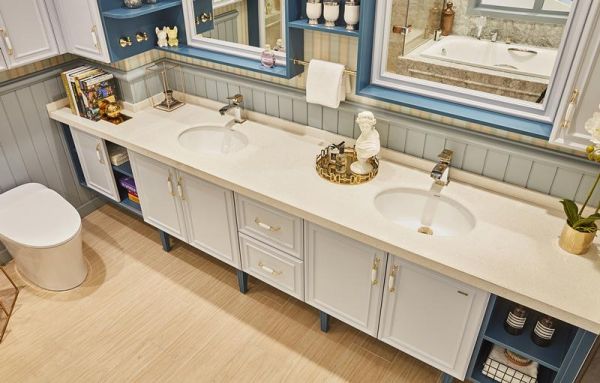 箭牌定制卫浴-阿曼达在盥洗盆下选用了双抽拉柜、双开门柜、推移门柜和开放格,组合扩容收纳空间,方便使用者根据洗漱品、美妆品或大件备用物件来分区放置,让日常收纳更加方便轻松。