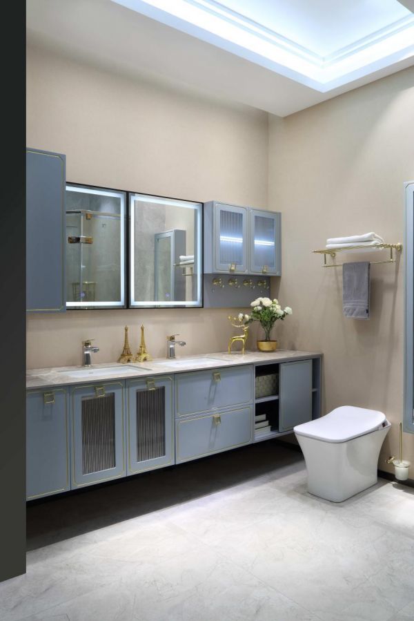 箭牌卫浴定制卫浴-云锦甄选了古朴的灰蓝色作为门板配色,典雅又朴素,再以新中式的金属线条勾勒柜门造型,以方形金色拉手点缀其中,让卫浴空间富有古韵的同时又不失现代感;而仿绸缎的半透明艺术玻璃门,则是定制卫浴-云锦的匠心设计,不仅使整个卫浴间更具中式韵味,而且还巧妙地呈现了产品名字“云锦”的意义。定制卫浴-云锦通过别具一格的设计,打造出带有传统韵味的卫浴美学,提升了卫浴间的美感度,将卫浴空间的价值再提升了一个度。
