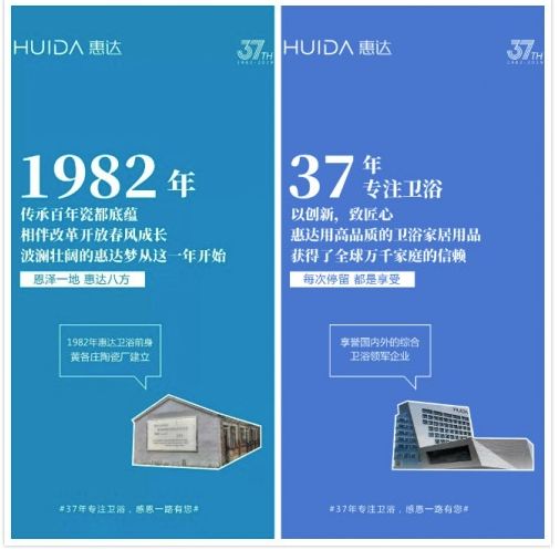 自成立伊始,惠达卫浴就一直秉承拼搏、创新、突破的精神,用37年走过了初创、夯实、腾飞、不断自我超越之路。发展至今,惠达已经跻身世界行业前列的卫浴企业,从传承工艺到自主技术屡获国际权威认可,从区域品牌到竞逐世界中高端市场的国际优秀卫浴品牌,从单一卫浴产品生产商到“整体浴室解决方案服务商”及“全卫空间开发大师”,惠达让国民消费者见证了民族卫浴品牌的崛起。