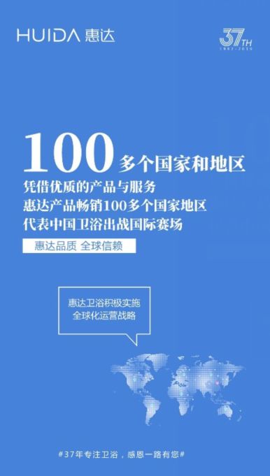 在世界卫浴领域,是由惠达卫浴代表中国卫浴征战国际赛场。37年来,惠达始终坚持以自有品牌输出和参与全球化竞争,见证并引领着中国卫浴的全球崛起。惠达在全球70多个国家和地区以自主品牌运营,近 40 个“一带一路”沿线国家和地区进行品牌输出、产品销售、服务支持,建立起覆盖了美国、英国、澳大利亚等 100 多个国家和地区的营销网络。