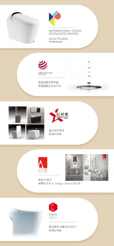 在与国际卫浴品牌竞争中,惠达卫浴先后斩获德国红点大奖、意大利A‘Design 设计奖,德国绿色产品奖、中国红星奖、红棉奖、美国IDEA设计大奖等国内外权威设计奖项。惠达用自己的产品、技术和质量走上世界舞台,以实力告诉世界,中国智造、中国品牌在国外不是只能卖低价,成功地改变了世界卫浴的品牌版图,让国民消费者见证了以惠达卫浴为代表的民族卫浴品牌的崛起。
