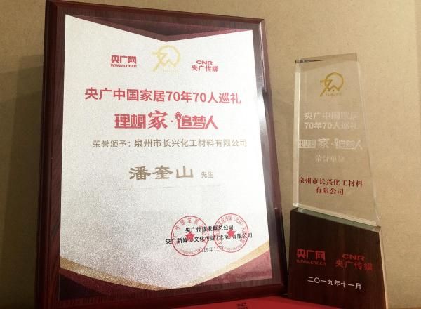 2019年11月 “理想家·追梦人”中国家居70年70人巡礼颁奖典礼暨2020央广大家居助力计划沟通会在广州隆重举行,凭借着企业高质量发展与对行业的卓越贡献,长兴化工荣获“中国家居70年70人巡礼荣誉单位”,长兴化工执行董事潘奎山荣获“中国家居70年70人巡礼企业家”称号。