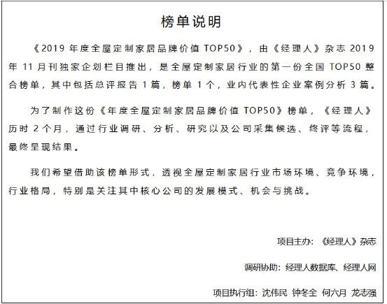以上内容,为《经理人》杂志2019年11月的专题企划:《2019年度全屋定制品牌排行榜TOP50——全屋定制,鏖战2000亿+》的部分节选。如有需要,请加经理人网微信公众号,并在公众号留言回复“2019榜单”文字,即可浏览完整版(含总评报告1篇,榜单1个,业内代表性企业案例分析3篇)。