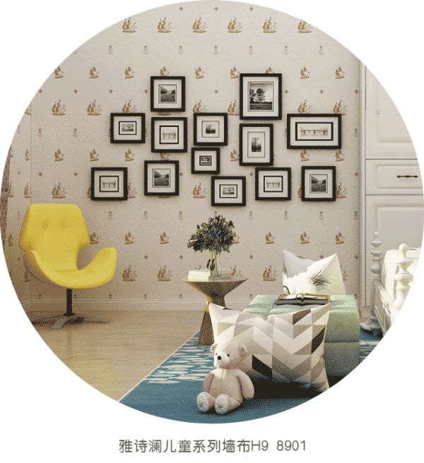 「雅诗澜墙布」儿童风格系列用世界地图花样打底开拓孩子的视野,埋下其对世界领域探索的种子,满足儿童的想像力,对孩子幼小的身心起到良好的促进作用。绣花样式的可爱卡通形象不仅丰富了室内儿童乐趣,增添美感,打造出舒适活泼却又不失精致的儿童房。
