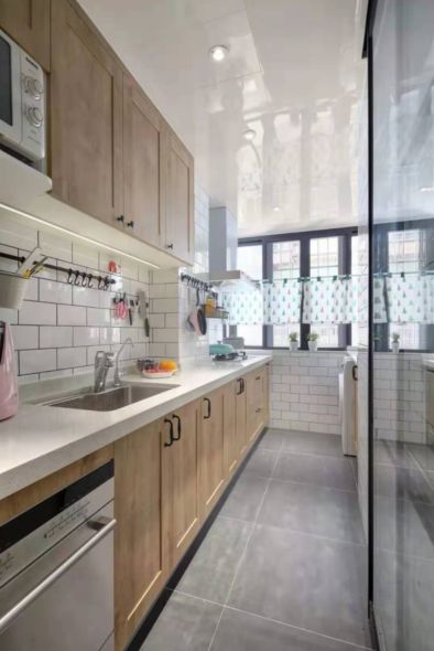 ▼对于厨房来说地面防磨耐脏很重要,一统家居小编喜欢这种使用深灰色瓷砖对厨房地面进行铺设的感觉。墙面上的长方形小白砖干净清爽,使紧凑的厨房看起来宽敞了不少。一排排的纯黑色置物杆,无形中扩大了厨房的空间。