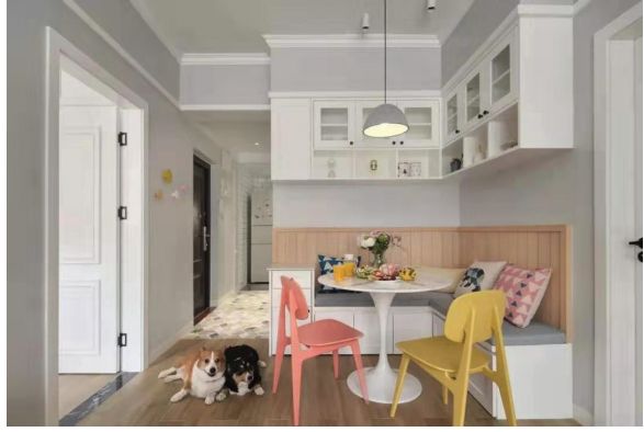 ▼两把糖果色餐椅十分小清新,加上萌宠的点缀,此刻画面简直太有爱了。卡座+吊柜则利用转角区的优势,进行半包围操作,这美观又超能屯的设计,对于小户型来说也太友好了吧~