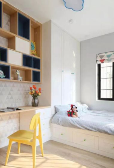 ▼一盏云朵样式的灯具,使孩子房充满童趣。组合式榻榻米、衣柜、书架,不仅看起来整洁利落储物也是一名好帮手。