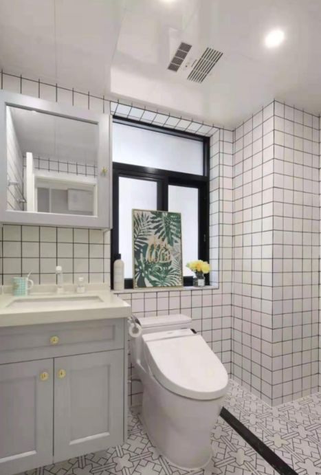 ▼卫生间用了防水小白砖做了全包设计,设计师为了划分出干湿区空间,地面的花砖被宽为5cm的黑线分隔,据一统家居小编了解为了更好的保护卫生间内部的隐私性,窗户使用了防走光的磨砂贴纸。