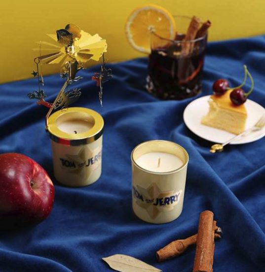 旋转香氛蜡烛礼盒,包含Tom & Jerry挂片旋转烛台一个,奶酪蛋糕味与肉桂苹果派味的香氛蜡烛各一只。梦幻的走马灯烛台在火焰散发的热气驱动下旋转,6枚电镀金属挂饰联动起来,经典再现Tom和Jerry追逐打闹的画面。