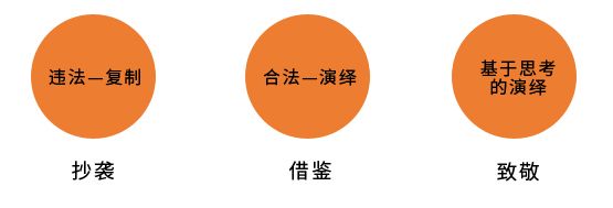 抄袭,借鉴,致敬,设计的三重境界,看到别人产品的优点,需要的是思考后的再演绎,而不是对产品创意违法的挪用剽窃。《中华人民共和国著作权法》中表示,抄袭是将他人作品或作品的片段窃为己有、抄录他人作品以为己作、对于原著未经或基本未经修改的抄录,就是一种侵犯著作权的行为。