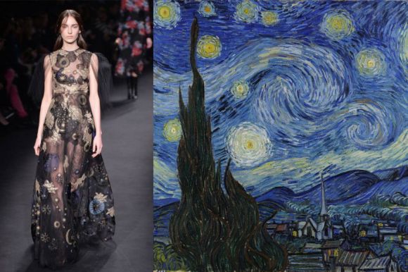 华伦天奴—Valentino,借鉴梵高画作《星空》中的元素,将复古蕾丝花纹和镂空面料运用到极致,带给大家如星空般的灿烂作品。《星空》给设计师带来灵感,画作和服装的结合又是一种创新。这就是借鉴。