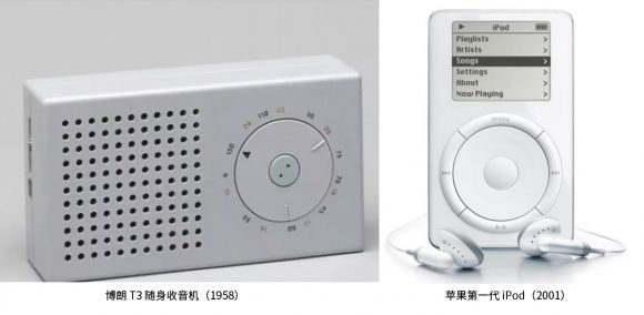 虽然两者外观有一定相似度,但是苹果的产品本身仍然是有革新性的。如图,苹果将博朗收音机的操控方式变成 iPod专属的触控转盘,这样的设计延续了博朗的元素与理念,并用苹果的方式完成了面向现代与未来的传承。这可以说是苹果对博朗的致敬。在工业设计纪录片《Objectified》当中,迪特·拉姆斯也曾表示:苹果是唯一遵循他的“好的设计”原则去设计产品的公司。