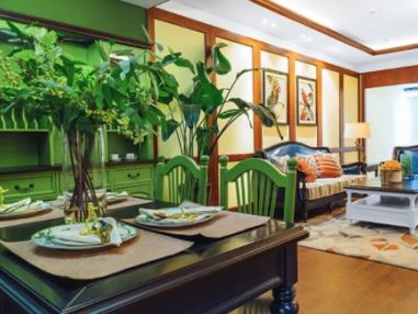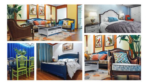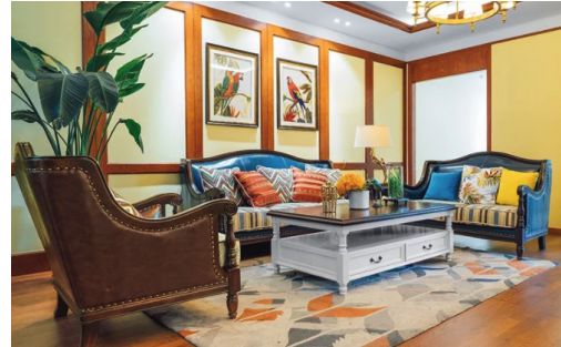 众所周知,美式家装风格具有这些特点:怀旧情怀,保留了欧洲的文化情怀;融合移民时代的航海元素;美国幅员辽阔,家居设计在比例上更大、更有气势。由此可见,全包圆的美式样板间—《幻月小镇》完整的体现了美式风格的精髓,客厅主要以亮黄色为主色调进行对比搭配,红棕色的家具和门框凸显出家中点线面的设计感,瞬间让空间灵动起来,展现了浓浓的欧式复古气息。