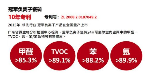 除了方便铺贴与美观层面的设计突破,冠军磁砖的负离子功效更是让瓷砖具有"功能性"。24小时释放健康负离子,清除和分解有害物质,如甲醛、苯、氨、TVOC等,为每个家庭带来清新健康的空气,也是冠军磁砖作为行业领军者带来的瓷砖黑科技。