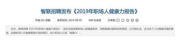 据《2019年职场人健康力报告》数据显示,仅二成白领认为身体健康状况良好,93.4%的白领认为自己的负面情绪来源于职场。而在“你能否承受加班?”已经成为各大企业HR面试时的口头禅之后,企业对于员工健康的关心程度已不能仅凭一张体检卡来衡量。