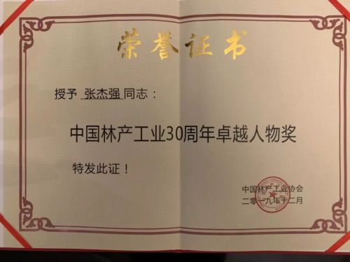 大会现场,富林地板张杰强董事长被授予“中国林产工业30周年卓越人物奖”,该奖项由协会聘请多位行业资深专家组成专家评委会,经认真评议、综合打分,并履行公示、核准等程序最终评定。
