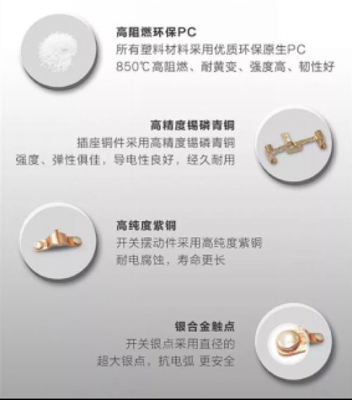 导体材料直接决定开关性能,好的开关选用纯度高的铜件,导电性好,弹性好,且有一定的厚度,保证其性能和安全性。优质的开关插座银触点大,因为触点在插座使用过程中容易产生氧化和电解。差的开关插座金属材质差,缺斤短两,会导致产品性能差,寿命短,还会有安全隐患。
