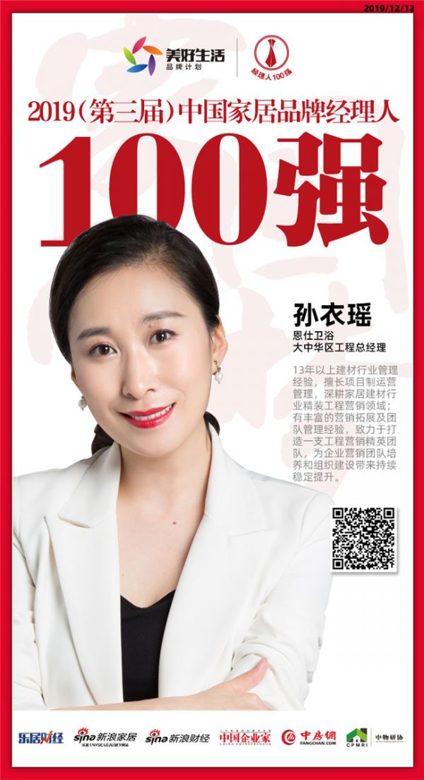 2019年12月12日,“致敬追梦人·致远中国梦——2019(第三届)中国地产新时代盛典暨2019中国家居新浪潮盛典”在北京举行。盛典现场,“2019(第三届)中国家居品牌经理人评选”结果揭晓。恩仕卫浴大中华区工程总经理孙衣瑶获“2019中国家居品牌经理人100强”。