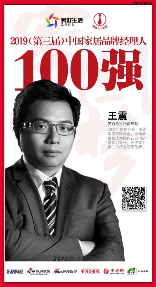 2019年12月12日,“致敬追梦人·致远中国梦——2019(第三届)中国地产新时代盛典暨2019中国家居新浪潮盛典”在北京举行。盛典现场,“2019(第三届)中国家居品牌经理人评选”结果揭晓。梦百合执行副总裁王·震获“2019中国家居品牌经理人100强”。