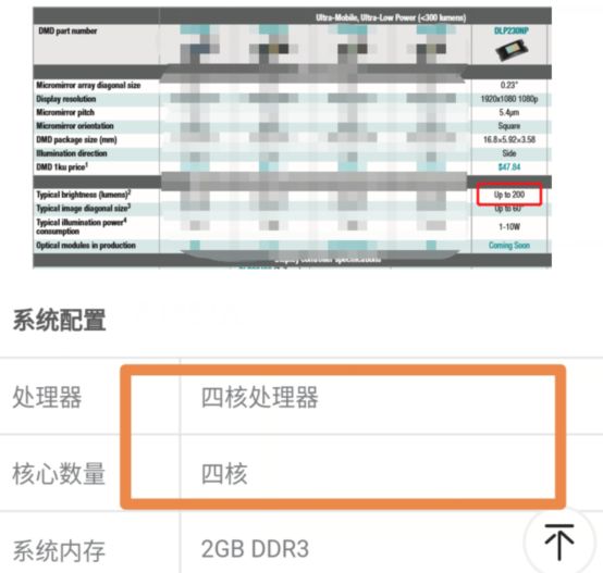 但作为G7的升级版G7S的配置却大幅缩水,显示芯片变成0.23DMD,投影仪的DMD显示芯片与投影仪的亮度、画质息息相关尺寸越大投影效果越好,专业数据显示0.23DMD芯片只能达到200ANSI流明(相当于光源亮度600)经过亮度优化能够达到300ANSI流明但远低于官方宣称的750ANSI流明。这颗显示芯片的原生分辨率为540p,虽然坚果使用了XPR技术但很难保证1080P的实际显示效果,4核心处理器在某东上没有介绍品牌被一笔带过。