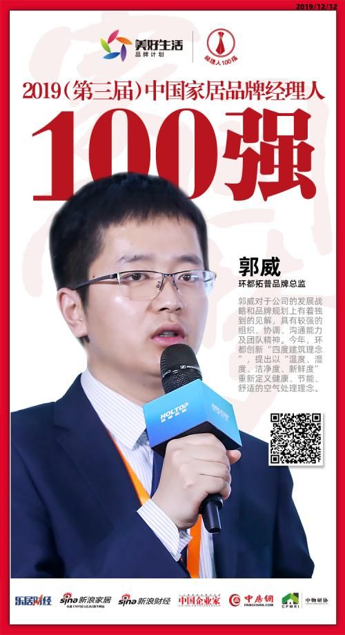 2019年12月12日,“致敬追梦人·致远中国梦——2019(第三届)中国地产新时代盛典暨2019中国家居新浪潮盛典”在北京举行。盛典现场,“2019(第三届)中国家居品牌经理人评选”结果揭晓。环都拓普品牌总监郭威获“2019中国家居品牌经理人100强”。