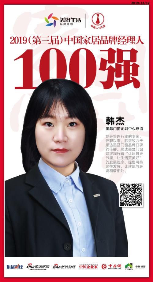 2019年12月12日,“致敬追梦人·致远中国梦——2019(第三届)中国地产新时代盛典暨2019中国家居新浪潮盛典”在北京举行。盛典现场,“2019(第三届)中国家居品牌经理人评选”结果揭晓。墨瑟门窗企划中心总监韩杰获“2019中国家居品牌经理人100强”。