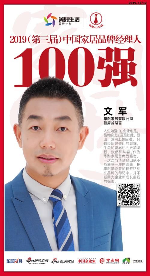 快讯:华耐家居文军荣获2019中国家居百强经理人