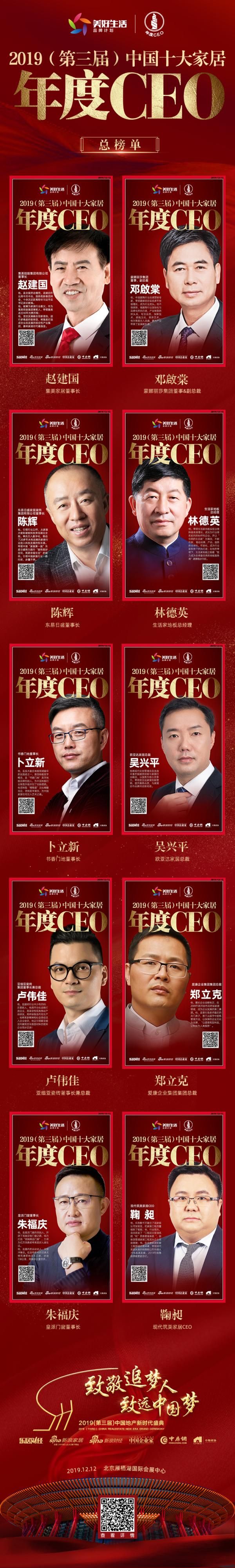 12月12日,“致敬追梦人·致远中国梦——2019(第三届)中国地产新时代盛典”在北京雁栖湖国际会展中心顺利举行,盛典现场揭晓“2019中国十大家居年度CEO”榜单。