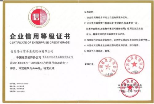 诚信是立业之本。作为建筑装饰行业领航者,海骊自创立之初,就一直秉承“诚信、守约”的价值理念,将诚信建设融入到品牌发展和企业文化建设中来,并作为公司经营体系的基础模块重点推进,先后获得全国住宅装饰装修行业质量服务诚信企业、山东省建筑装饰行业优秀企业等多项荣誉,在业界树立了良好的信用口碑。