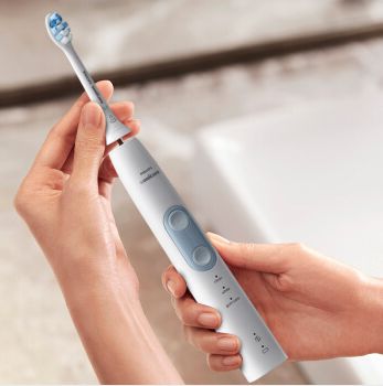飞利浦 HX6859 电动牙刷有3种清洁模式,外观设计比较时尚简约,它的震幅是31000次/min,弧形刷头,刷头上的是细韧软刷毛,附有旅行盒,可以两分钟智能计时关机 。