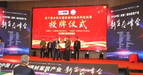 12月10日,2019中国(成都)建材家居产业新生态峰会,广东海顺新材料科技有限公司(以下简称“海顺科技”)快干型水性木器漆涂料体系科技成果授牌仪式隆重举行。中国高科技产业化研究会、中国建筑材料流通协会、全国工商联家具装饰业商会、四川省建材家具装饰商会、广东省门业协会、广州市定制家居行业协会、九正科技集团、九正建材网、掌上明珠家居、尚品宅配、千川木门、海尔家居、皇朝家私、龙马木业等多家行业协会以及多家行业媒体共同见证了这一难忘的时刻。
