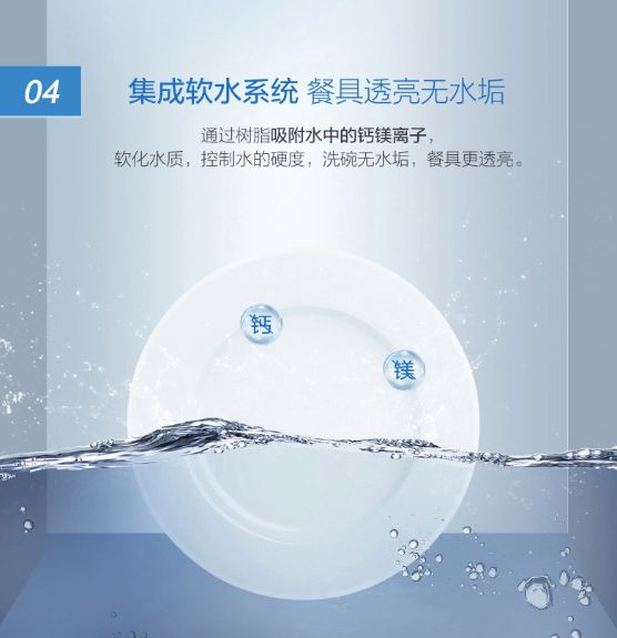 这款洗碗机使用全方位喷淋洗涤模式。在冲洗的过程中,两个喷淋臂高速旋转喷淋,72℃的高温高压水流强力冲刷,强力剥离顽固污渍。接下来,3重高效过滤,有效去除循环水中的残渣,洗碗更干净。过滤装置易拆卸清洁,无堵塞,没有异味。洗碗机中还集成了软水系统,通过树脂有效吸附水中的钙镁离子,软化水质,让餐具更透亮洁净。