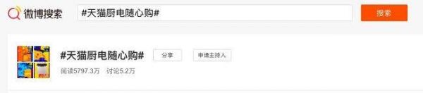 12月7日,“天猫厨电随心购”活动正式发布,相关话题#天猫厨电随心购#同步上线,凯度、华帝、方太、松下、美的、老板电器6大品牌官博发布活动海报,开始活动预热。