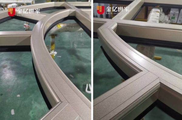 异型窗弯曲多,拼接难度也大,金亿世家门窗从原材料开始层层把控质量。