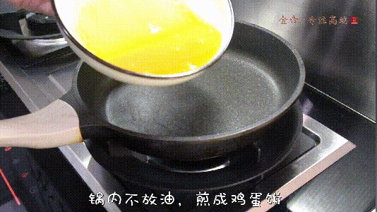 1、鸡蛋内放入少许的盐,充分打散,锅里不放油,煎成鸡蛋饼