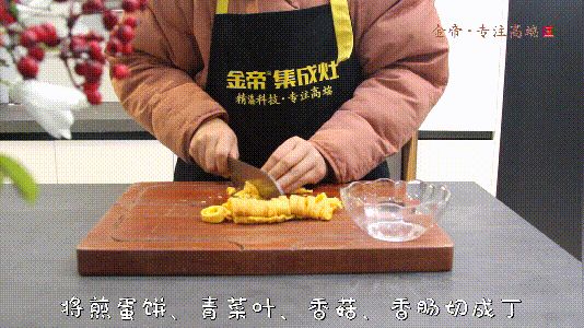 2、将青菜、火腿、香菇、鸡蛋饼剁碎,尽量剁得碎一点